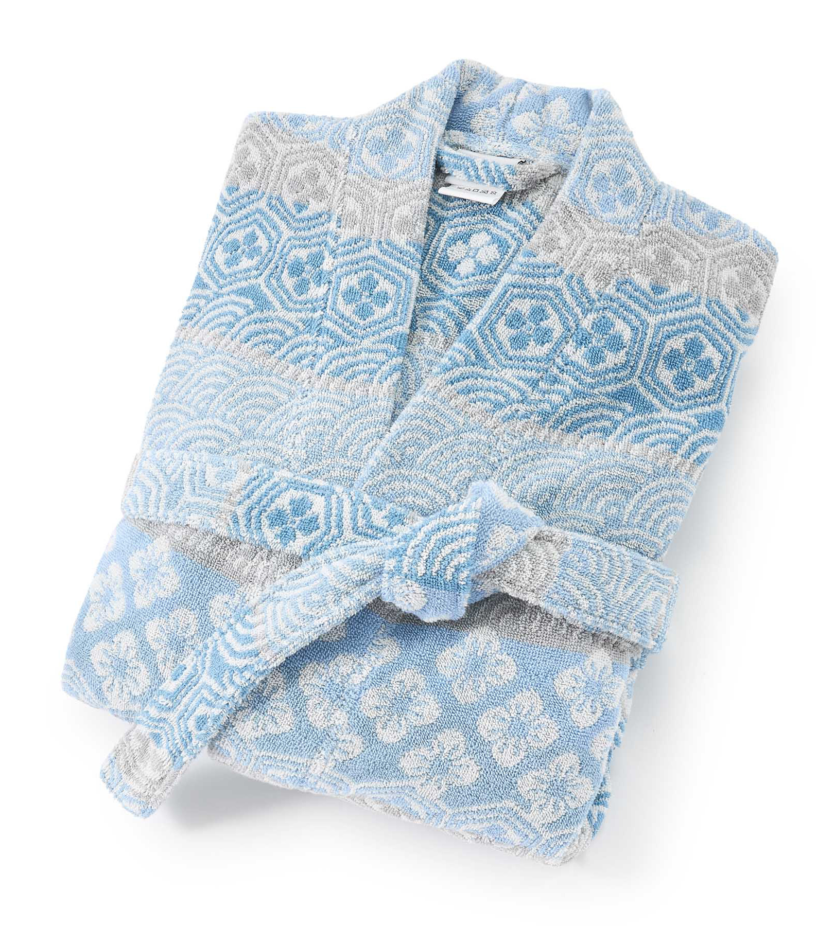 Dieser Bassetti-Bademantel ist weich und angenehm auf der Haut zu tragen, darüber hinaus sehr strapazierfähig und langlebig: Ein flauschig weicher, Jacquard gefärbter Bademantel mit Außentaschen und Bindegürtel aus 100% Baumwolle (380 gr/qm), strapazierfähig und saugstark im unverwechselbaren Bassetti-Look.