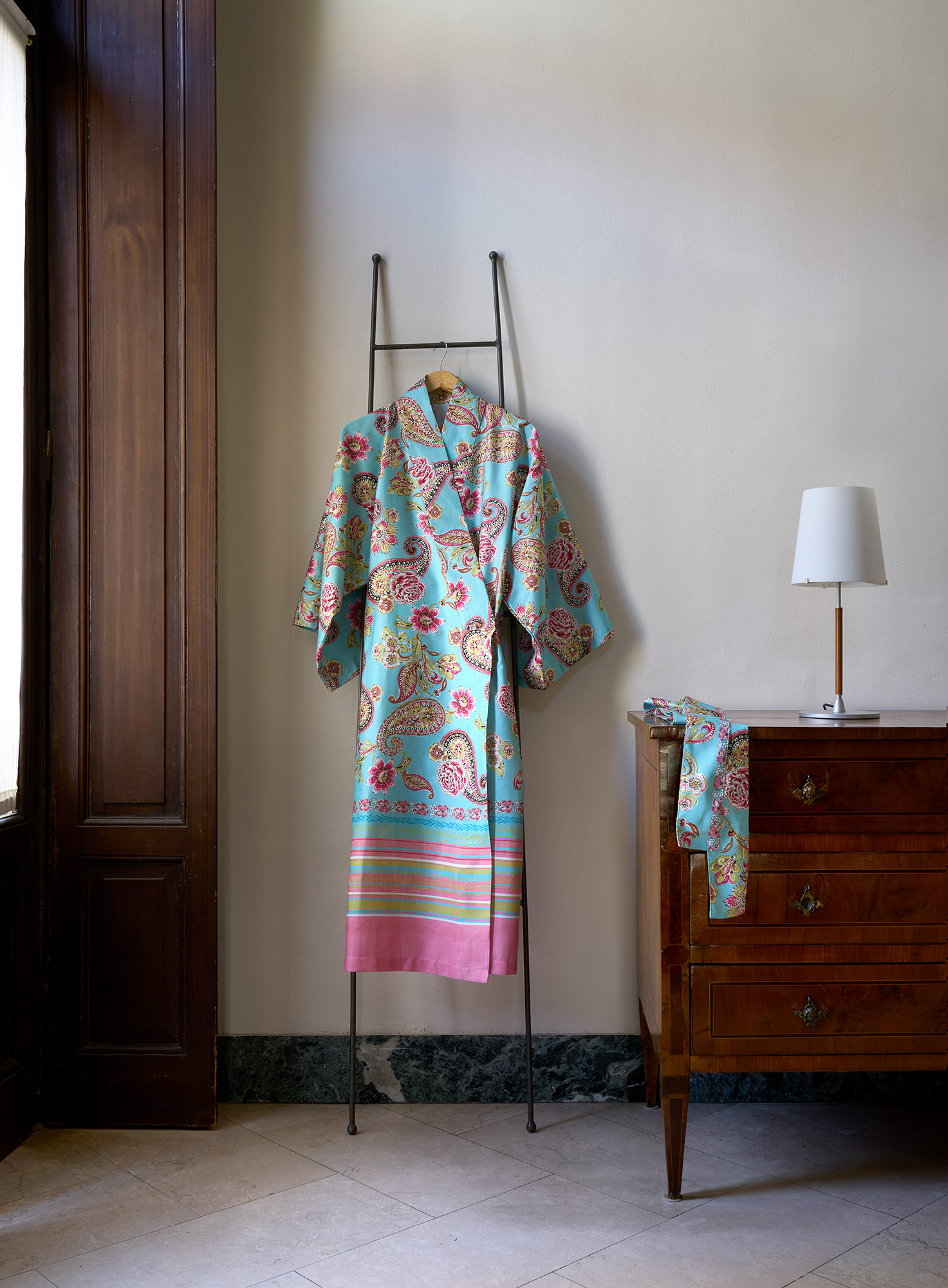 Der in einem schicken Geschenkkarton verpackte Bassetti-Kimono ist mit beständigen Farben garngefärbt, bei 60°C waschbar und trocknergeeignet.