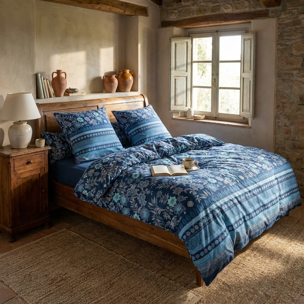 Das Dessin VARIGOTTI B1 Blau nimmt uns mit in die faszinierenden Pallanca-Gärten von Bordighera, wo üppige Blüten sowie exotische, duftende Pflanzen als Inspirationsquelle dienen. Die Motive entfalten sich in einem botanischen Design, das durch ein in Batiktechnik gestaltetes Blumenmuster geprägt wird. Ergänzt wird es durch ein harmonisches Rankenmotiv, das an den Abschlüssen von einem eleganten Volant eingefasst wird, in dem sich geometrische Elemente und natürliche Formen kunstvoll abwechseln.